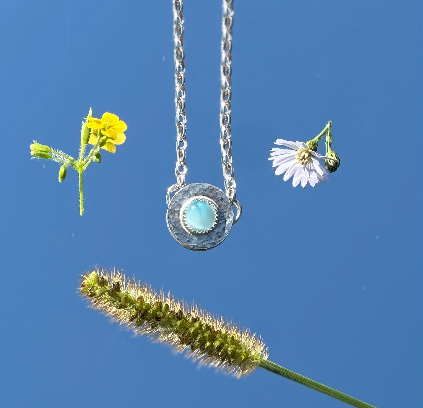 Discover the rare beauty of our Larimar Choker necklace. The stunning, hammered sterling silver showcases a stunning larimar stone, while the lightweight and durable chain is perfect for any occasion. A must-have for any jewelry collection.