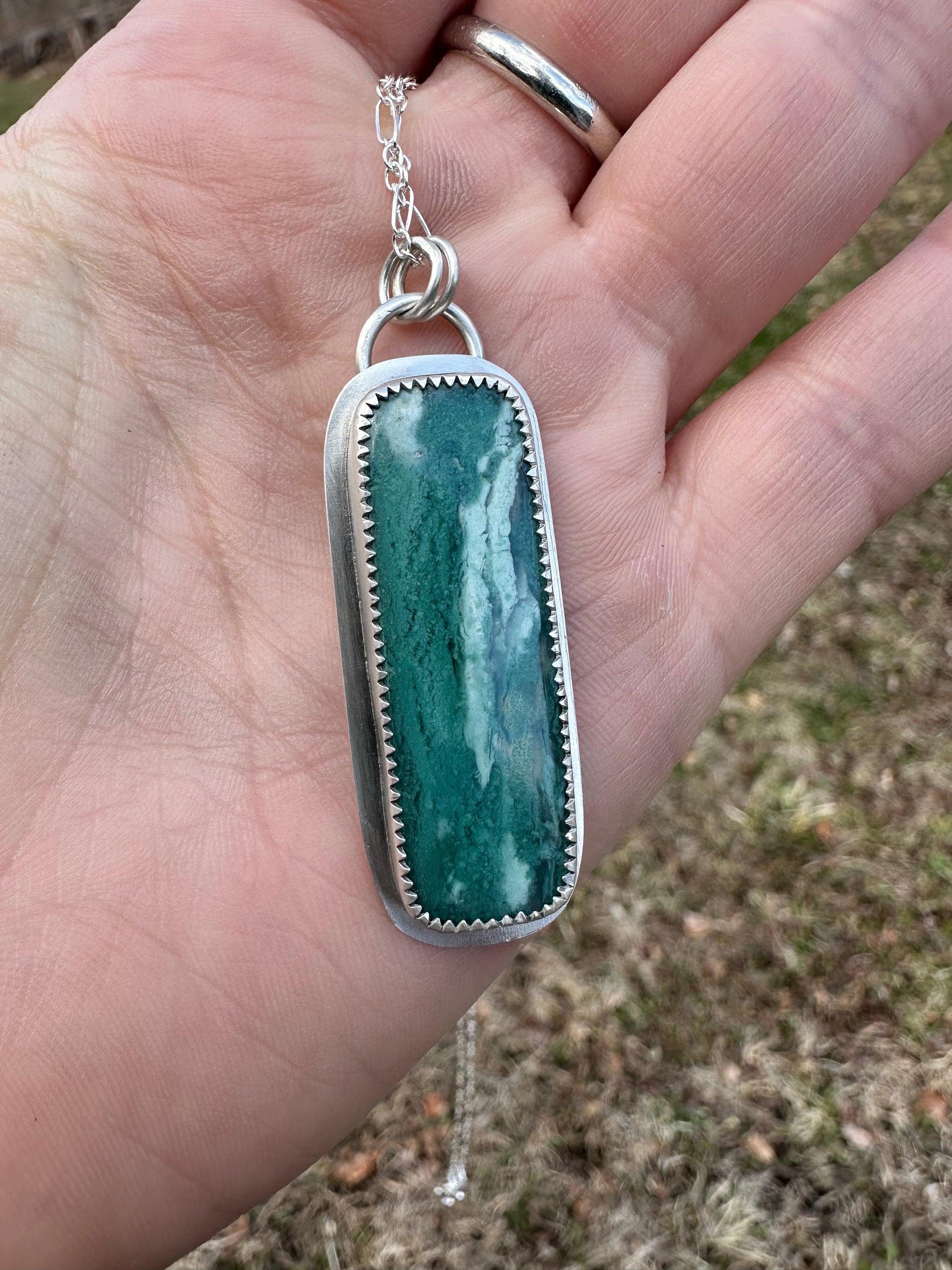 Forged with sterling silver, this necklace features a beautiful chrome chalcedony stone. A secret message hand-stamped on the back with a special cut out to add a little magic!
