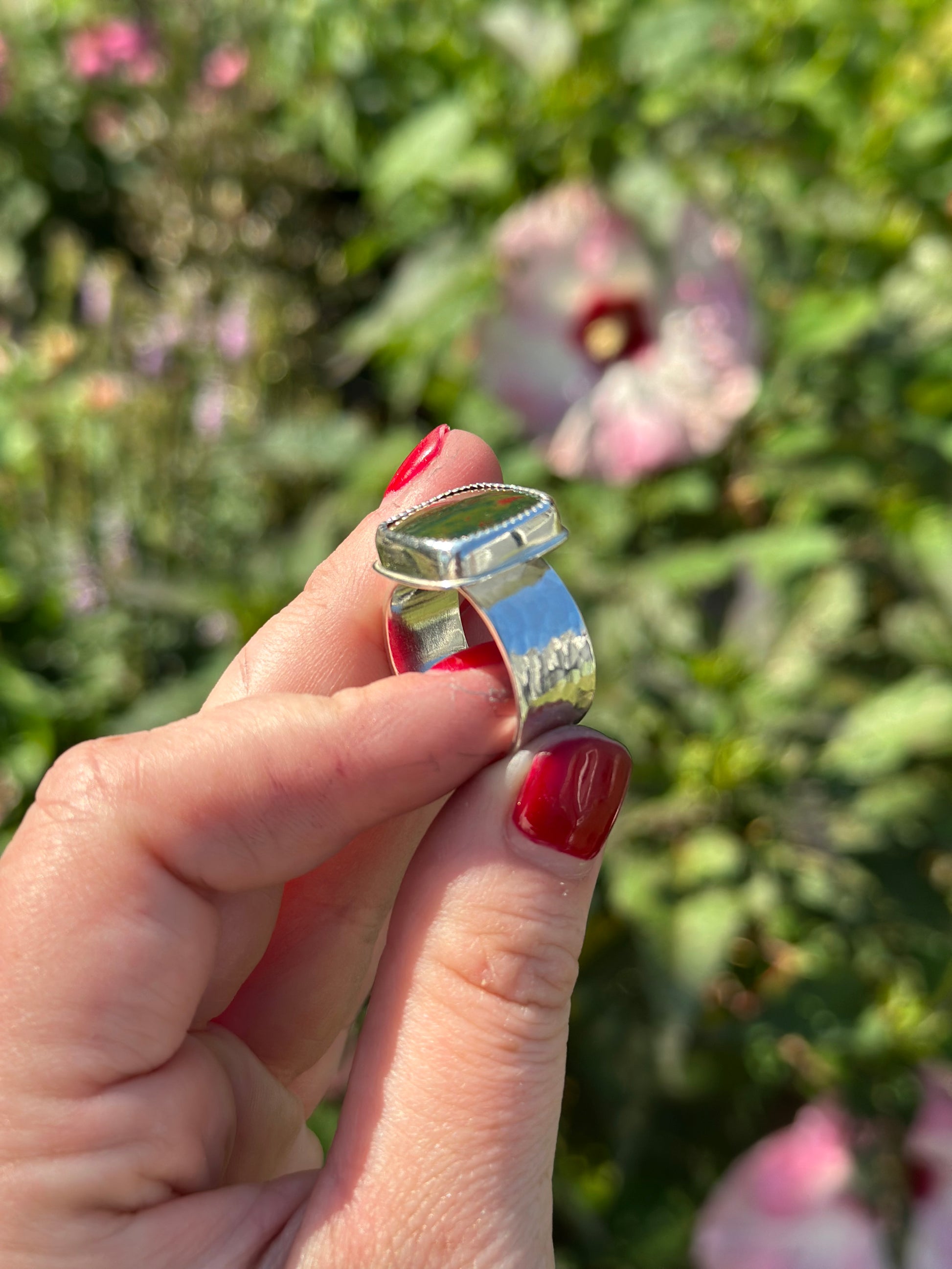 Expertly handcrafted, this silver ring showcases a stunning bloodstone. The hand hammered texture adds a touch of magic to this unique piece. Experience the beauty and craftsmanship of this one-of-a-kind, handmade ring.